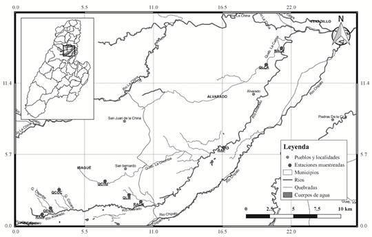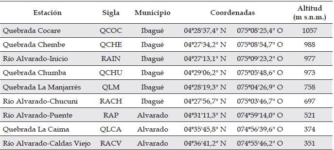 Área de estudio. El río Alvarado pertenece a la cuenca del río La China, que a su vez hace parte del sistema del río Totare, cuenca del río Magdalena, en el departamento del Tolima. Presenta un área de 29988,14 hectáreas, un perímetro de 91,66 km y una longitud del cauce de 55,06 km (Cortolima, 2009). De acuerdo con la clasificación de las zonas de vida de Holdridge (Pizano y García, 2014), el río Alvarado se localiza dentro del ecosistema del bosque seco tropical del departamento del Tolima, y, por su ubicación, fertilidad de sus suelos y condiciones ecológicas, se ha visto reemplazado a lo largo del tiempo por grandes zonas de cultivo, pastos para ganadería y urbanización (Cortolima, 2009).