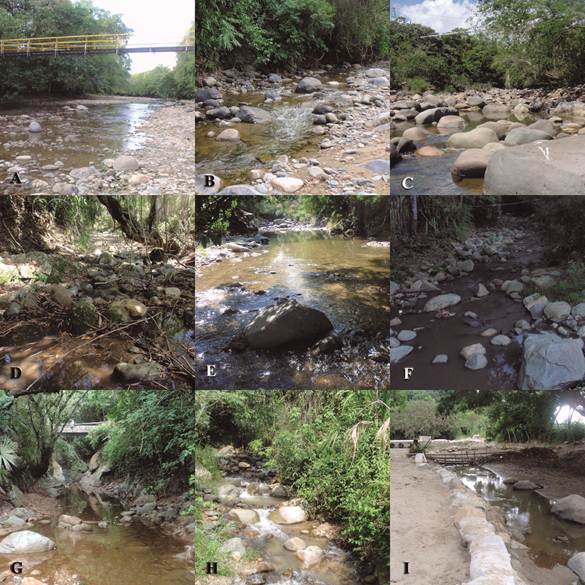 Toma de muestras. Durante dos periodos hidrológicos correspondientes a altas y bajas lluvias, entre septiembre y diciembre de 2012, se tomaron muestras en microhábitats de arena (A), hojarasca (H), grava (G) y roca (R) en nueve puntos del río Alvarado y sus tributarios (Figura 1; Tabla 1). Para esto se empleó una red Surber de 250 μm con un área de 0,09 m2, siguiendo la metodología propuesta por Wantzen y Rueda (2009) en tramos impactados y no impactados por la urbanización y la agricultura (Figura 2).