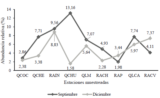 Distribución temporal. En septiembre se evidenció el mayor registro de riqueza, densidad y abundancia de organismos recolectados en comparación con lo muestreado en el mes de diciembre (Anexo 2). Sin embargo no hubo diferencias significativas (U = 710, n = 41, p = 0,23) entre las densidades y abundancias a nivel temporal. Para el primer periodo las 1941 (59,12%) larvas de dípteros analizadas se distribuyeron en 8 familias, 13 subfamilias y 39 géneros, mientras que en diciembre se registraron 1342 (40,87 %) distribuidas en 6 familias, 11 subfamilias y 32 géneros. En ambos periodos, se destaca la presencia de las subfamilias Chironominae, Orthocladiinae y Tanypodinae, con una abundancia relativa del 43 %, 27 % y 5 %, respectivamente (Anexo 2). Con respecto a la distribución temporal de las larvas por cada punto muestreado, se evidenció una disminución en el número de organismos en todas las estaciones; sin embargo, en RAP y RACV el número de individuos aumentó de septiembre a diciembre (Figura 3). En estas estaciones, se registró una gran abundancia relativa de larvas de la familia Chironomidae, en la cual se destacan los géneros Cladotanytarsus, Cricotopus, Dicrotendipes, Larsia, Onconeura, Polypedilum, Paratanytarsus y Saetheria.
