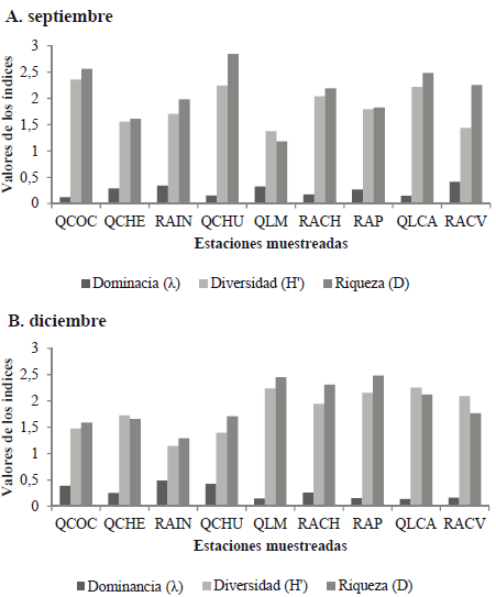 Índices ecológicos. Los valores de los índices muestran una gran diversidad y riqueza de géneros para los períodos muestreados. En septiembre, estaciones como QCHU y QCOC evidenciaron valores elevados de riqueza y diversidad, mientras que QLM presentó valores bajos (Figura 4A). Para el periodo de diciembre QLM, RACH y RAP presentaron los índices de riqueza y diversidad más elevados, contrario a la estación RAIN que evidenció valores bajos (Figura 4B). Con respecto al índice de dominancia, para el periodo de septiembre estaciones como RACV, RAIN, QLM, y QCHE mostraron valores elevados, mientras que para diciembre los puntos QCOC, RAIN y QCHU reflejaron índices de dominancia elevados (Figura 4A-B).