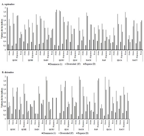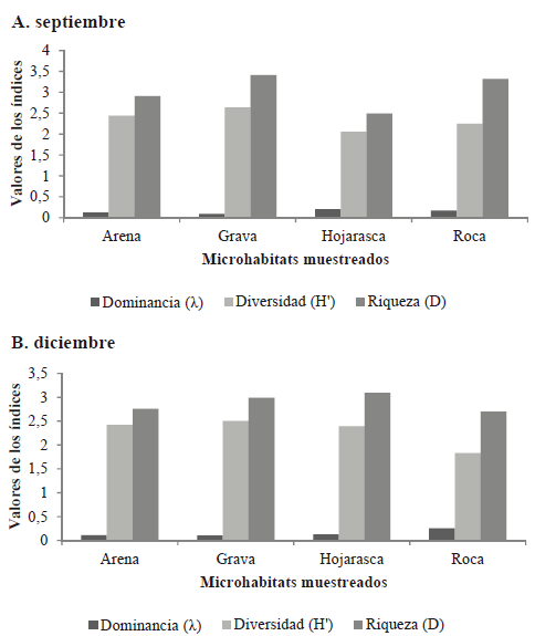 En cuanto a los sustratos muestreados, durante septiembre y diciembre se evidenciaron valores elevados de riqueza y diversidad, y bajos de dominancia para todos los microhábitats, aunque hojarasca y roca presentaron una dominancia moderadamente elevada en los dos periodos muestreados (Figura 5A-B).