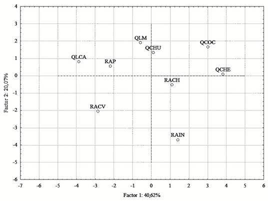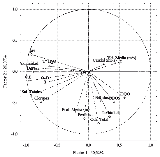 Con respecto al Análisis de Componentes Principales (ACP), los dos primeros factores explican el 60,69 % de la varianza acumulada (Figura 7). El primero de ellos mostró que las variables de mayor contribución y correlación fueron conductividad eléctrica, pH, sólidos totales, alcalinidad y dureza, variables que denotan procesos de mineralización en las aguas (Ramírez y Viña, 1998a). Para el segundo componente, las variables de mayor contribución y correlación fueron turbiedad, fosfatos y coliformes totales. De acuerdo con lo registrado por Ramirez y Viña (1998a), las variables de mayor contribución en el segundo componente denotan procesos asociados a oxido-reducción de materia orgánica y procesos de contaminación o intervención antrópica (Figura 7). Comparando esto con la proyección obtenida de las estaciones, puntos como QLCA, RAP y RACV se disgregan en igual dirección a las variables de mayor contribución en el primer componente, mientras que la estación RAIN cercana a asentamientos urbanos, se disocia hacia las variables de mayor correlación del segundo componente (Figura 8).