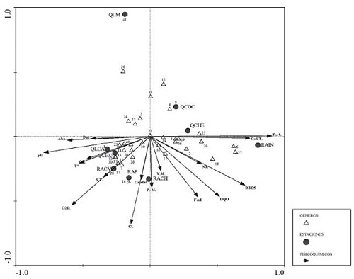 Se evidencia en el Análisis de Correspondencia Canónica (ACC) una fuerte correlación entre las variables coliformes totales y turbiedad con la estación RAIN. La presencia de géneros como Chironomus y Nanocladius estuvo asociada a estos parámetros. A su vez, este tipo de correlación también se muestra en variables como alcalinidad - dureza, conductividad eléctrica - temperatura del agua y oxígeno disuelto - sólidos totales. A estas, se asocian las estaciones QLCA, QCHU y RACV, junto a los géneros Anopheles, Bezzia, Cladotanytarsus, Dasyhelea, Dicrotendipes, Forcipomyia, Limonia, Odontomyia, Paracladius, Paratanytarsus, Pelumos, Pericoma, Riethia y Thienemanniella. Sin embargo, géneros como Xestochironomus, Cardiocladius, Chelifera y Clinocera no se asociaron a las variables fisicoquímicas evaluadas, en las estaciones QCOC y QLM (Figura 9).