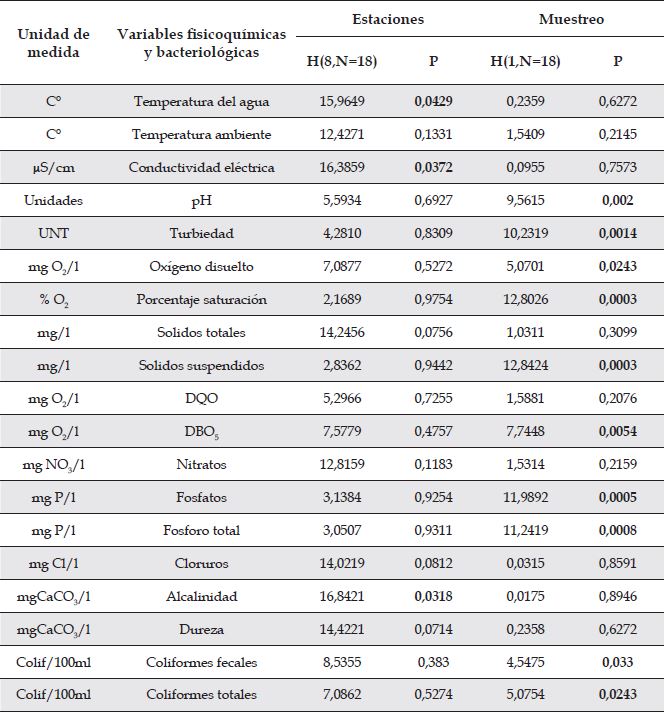 Variables fisicoquímicas y bacteriológicas. Las variables fisicoquímicas analizadas no evidenciaron diferencias significativas (p > 0,05) a los largo de las nueve estaciones de muestreo, a excepción de la temperatura del agua, conductividad eléctrica y alcalinidad (Tabla 2). Por otra parte, a nivel temporal se reflejaron cambios significativos en los parámetros analizados, lo cual puede ser atribuido a factores externos como las condiciones climáticas y antropogénicas de la región durante los dos periodos de estudio (Tabla 2).