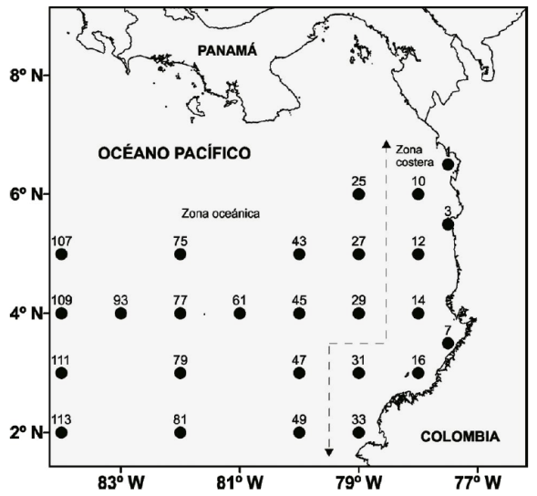 Durante cada uno de estos cruceros, seguimos un plan de muestreo de 26 estaciones oceanográficas (Figura 1). En cada estación recolectamos zooplancton mediante arrastres oblicuos (en promedio de 160 m de profundidad hasta la superficie) con una red tipo bongo de 0.3 m de diámetro de boca y 250 µm de luz de malla. Instalamos un registrador de flujo mecánico General Oceanics modelo 2030, previamente calibrado, en una de las bocas de la red con el propósito de establecer el volumen de agua filtrado siguiendo las instrucciones del fabricante. El tiempo de arrastre fue de 10 minutos en fondo y la velocidad de arrastre fue de 3 nudos. En total se recolectaron y analizaron 76 muestras de zooplancton que fueron preservadas en formol al 4 % neutralizado con borato de sodio. Posteriormente las muestras fueron transportadas al laboratorio del Grupo de Investigación en Ciencias Oceanográficas de la Universidad del Valle, Colombia, para su procesamiento.