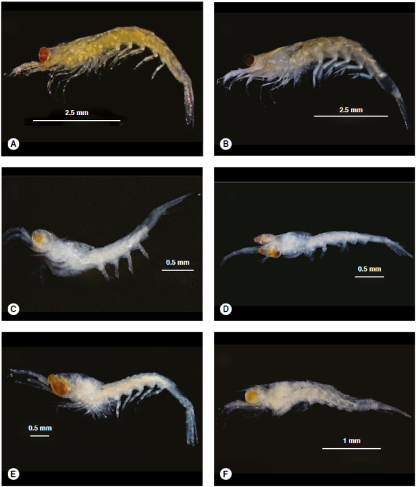 Estos organismos pertenecen al orden Euphausiacea, que incluye 2 familias, 11 géneros y 86 especies en todo el mundo (Baker et al., 1990; Brinton et al., 2000). Aunque todas las especies de eufáusidos hasta ahora descritas están incluidas en las claves taxonómicas de Baker et al. (1990) y Brinton et al. (2000), es útil hacer claves taxonómicas para grupos de especies que habitan en regiones relativamente menos estudiadas. Estas claves deben considerar entre las principales características morfológicas para la identificación de las especies de eufáusidos la forma de los ojos, la presencia o ausencia de espinas o procesos en los diferentes segmentos del pedúnculo de la primera antena y, en caso de estar presentes, su forma, la presencia o ausencia de espinas en el abdomen, el número de apéndices torácicos alargados y con el último segmento de las mismas modificado, entre otros caracteres taxonómicos distintivos. La forma del petasma (órgano reproductor masculino) es también un carácter diagnóstico valioso para la diferenciación entre especies; sin embargo, este es muy pequeño y sirve únicamente para la identificación de machos adultos (Baker et al., 1990).