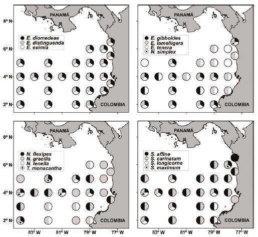 Existen dos formas reconocidas, la “vieja forma” y la “nueva forma” (Brinton et al., 2000). La “vieja forma” se encuentra en los océanos Pacífico e Índico, aproximadamente entre los 20 °N y los 20 °S. Los adultos de esta especie realizan migraciones verticales, encontrándose en el día cerca de los 400 m de profundidad, mientras que en la noche se encuentran entre 100 y 200 m de profundidad. Las larvas suelen estar presentes entre la superficie y 100 m de profundidad (Roger, 1971; Boden et al., 1955; Brinton, 1962, 1979; Brinton et al., 2000). Se registraron individuos de todas las fases de desarrollo, excepto machos adultos. López & Medellín (2010) registraron el género Nematoscelis, y la especie fue reportada en aguas del Pacífico colombiano por Hansen (1912). Encontramos la especie en toda el área de la cuenca Pacífica colombiana (Figura 4).
