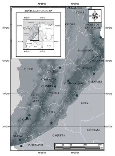 En Colombia, la distribución geográfica conocida de A. harrisii es bastante fragmentada. Se ha registrado en solo once localidades en un rango altitudinal desde los 800 hasta los 2900 m s. n. m. Fue registrada por primera vez en Colombia en 1939 en el cerro Munchique, en el departamento del Cauca (von Sneidern, 1954); posteriormente fue registrada en el municipio de Llorente y en el Río Mijitayo, Nariño (Fitzpatrick & Willard, 1982; Gutiérrez, 2000), en el Parque Natural Nacional Tamá, Norte de Santander (Borja-Acosta, 2017), en Samaná, Caldas (RNOA, 2014), Bojacá y Zipacón, Cundinamarca (Córdoba & Ahumada, 2005), Ibagué, Tolima (Parra-Hernández et al., 2007), Cajibío, Cauca (Ebird, 2018), Chámeza, Casanare (ICN_39300) y Cubarral, Meta (Ebird, 2018) (Figura 3).