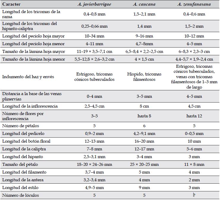 Allomaieta javierbarrigae se caracteriza por sus hojas con venación basal o levemente plinervia, el indumento estrigoso de tricomas cortos y rígidos en las partes vegetativas e inflorescencia, las flores 5-meras y los pétalos rosados. La especie más parecida es Allomaieta caucanaLozano (1999), pero esta última tiene flores 6-meras, indumento híspido, hojas conspicuamente plinervias, lámina foliar más pequeña, inflorescencia más larga, caliptra e hipanto mucho más grandes y estilo más largo (Tabla 1). Dentro del grupo de especies con flores 5-meras, se asocia a Allomaieta zenufanasanaLozano (1999), pero esta última tiene hojas conspicuamente plinervias, indumento pubescente sobre las venas, inflorescencia y caliptra-hipanto, inflorescencias con más flores y pétalos blancos mucho más pequeños (Tabla 1).