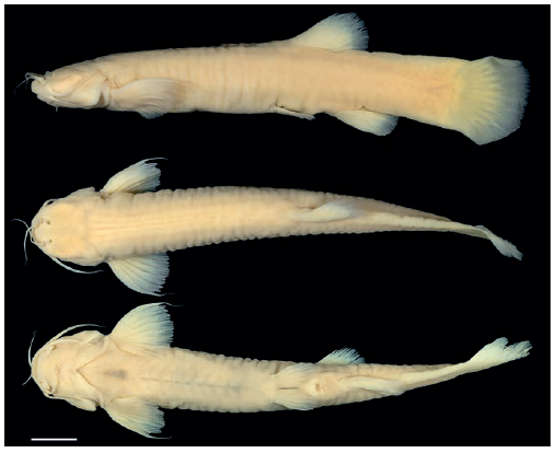 Description. Morphometric data presented in Table 1. Body elongated, nearly as deep as wide, gradually compressed posterior to dorsal-fin base. Dorsal profile of head straight and inclined upward, then straight to slightly convex just posterior to head to dorsal-fin origin and slightly concave along dorsal-fin base; right after dorsal fin-base, continues straight or slightly convex along caudal peduncle. Ventral profile straight to end of pectoral-fin base, straight to slightly convex to anal-fin origin, then abruptly sloping dorsally along anal-fin base and straight and sloping ventrally along caudal peduncle. Crosssection of body circular at pectoral-fin insertion. Body encircled by tegumentary rings almost until midlength of caudal peduncle, after preservation of specimens in ethanol.
