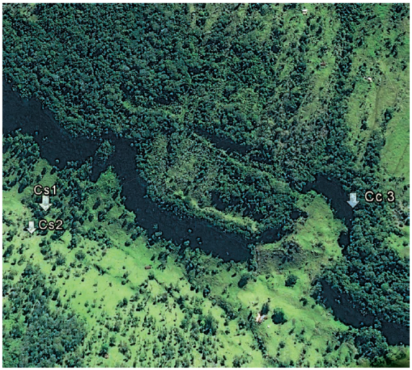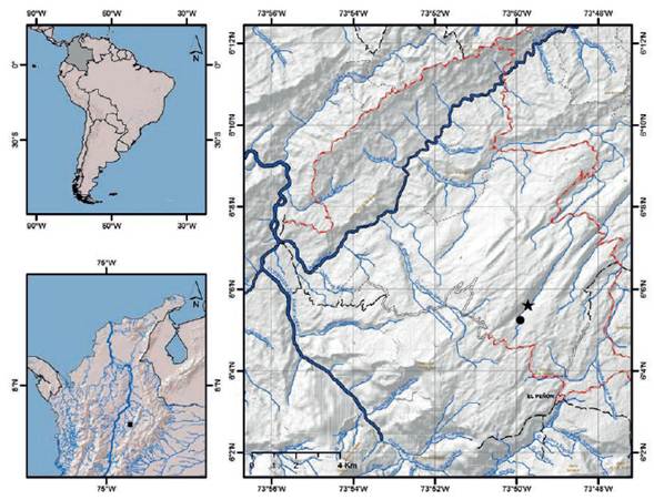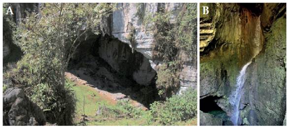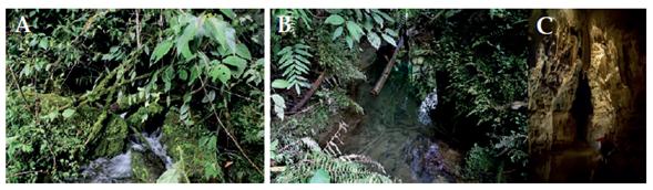 Distribution and habitat.Trichomycterus rosablanca is known exclusively from a stream tributary of the Horta River, draining the caves Las Sardinas and Caracol, in the upper Carare River drainage, corresponding to the middle Magdalena River basin (Figure 8). The caves Las Sardinas and Caracol are found between 2228 m and 2378 m of elevation. The subterranean stream draining the caves have clear waters, becoming turbid during the rains by heavy loads of clayey sediments. Physicochemical parameters measured during the collecting dates were the following: temperature 14.6°C, pH 7.9 in Las Sardinas Cave and 8.1 in Caracol Cave, total dissolved solids 132 ppm in both caves, and conductivity 231 µ/cm in Las Sardinas Cave and 242 µ/cm in Caracol Cave. Trichomycterus rosablanca was collected in a 20 m section of the stream that drains into a sink hole inside the wide opening gallery of Caracol Cave (Figure 9). Las Sardinas Cave has two openings (Figure 10, Figure 11) that are interconnected by a superficial stream flowing for around 200 m from the northern opening and inflowing the second southern opening (Figure 10). The specimens were collected at 230 m (dark section) inside the northern opening and in the epigean section of the interconnecting stream (Figure 8, Figure 9). Collecting efforts both in the epigean and hypogean systems failed to capture any other fish species in the region. This system of caves is part of the Rosablanca formation (Mendoza-Parada et al., 2009).