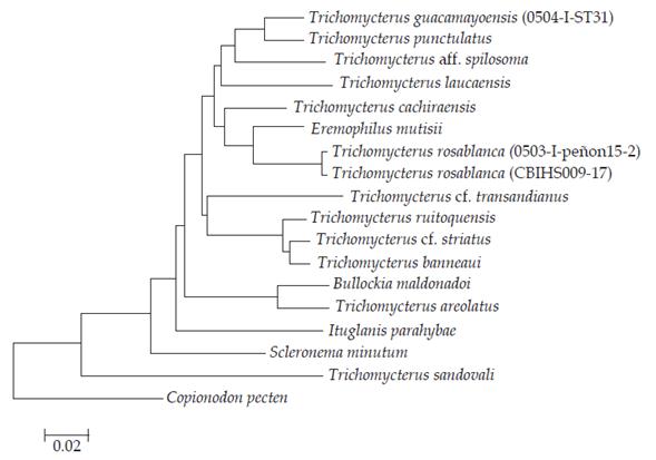 A set of 14 cytochrome C oxidase subunit I (COI) sequences of trichomycterids was obtained from Ochoa et al. (2017), including two newly added species (Trichomycterus laucaensisArratia, 1983 and Trichomycterus guacamayoensis Ardila Rodríguez, 2018), all available at Genbank (Table 1). Species sequences compared in our genetic analyses were selected (according to their availability) following two main criteria: (1) trichomycterines that share with Trichomycterus rosablanca, an interrupted supraorbital canal at the nasal section (Eremophilus mutisii Humboldt, 1805, T. laucaensis, and T. punctulatus Valenciennes, 1846), and (2) troglobitic species of Trichomycterus from cave systems geographically close to the type locality of the new species (T. sandovali and T. guacamayoensis). In addition, sequences from northern trans-Andean species of Trichomycterus analyzed by Ochoa et al. (2017) and clustered into the clades D1 and D2 were incorporated, as well as representatives of other trichomycterine genera (Bullockia, Ituglanis, and Scleronema). The tree was rooted with Copionodon pectende Pinna, 1992, a representative of the clade Copionodontinae+Trichogeninae, hypothesized as the sister group of remaining trichomycterids (Datovo & Bockmann, 2010; Ochoa et al., 2017).