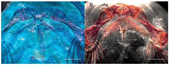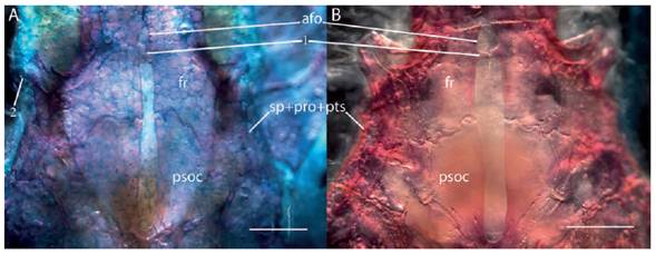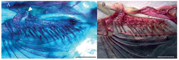 Anterior margin of mesethmoid almost straight with a slight mesial concavity. Anterior fontanel small ovoid opening slightly shorter than epiphyseal bar. Lachrimal/antorbital not enclosing anterior section of infraorbital canal (sensory pores i1 and i3), but attached antero-ventrally (Figure 3). Sesamoid supraorbital as a long straight rod, without lateral processes, attached posteriorly to dorsoposterior corner of lateral ethmoid. Lateral process of frontal and sphenotic, where infraorbital canal leaves neurocranium, forming conspicuous anterolaterally projected postorbital process. Posterior fontanel rectangular in shape and long, ca. 9-10 times longer than anterior fontanel, extending anteriorly between posterior region of frontals and reaching posteriorly last third of parieto-supraoccipital (Figure 4A). Epiotic with smooth margins. Posttemporo-supracleithrum with long pointed anterior process, running along posteromedial margin of base of wing-like lateral process of pterotic and lying dorsal to center of pterotic. Medial process of posttemporo-supracleithrum attached directly to ventral surface of anterolateral region of Weberian capsule and ending in a pointed tip close to basi-exoccipital. Vomer arrow shaped with relatively short posterior process (not exceeding posteriorly anteromedial junction of orbitosphenoids) inserted into anterior process of parasphenoid. Lateral process of vomer slightly bifid, with posterior arm longer. Posterior process of parasphenoid long and extending over anterior portion of basi-exoccipital, laterally bordered by two extensive anterior membranous processes of basi-exoccipital. Optic foramen present but reduced to a small orifice in posterior region of orbitosphenoid, close to articulation with frontal. Lateral opening of Weberian capsule constricted at tip of lateral projection. Conspicuous convex lamina along posteroventral margin of lateral projection of Weberian capsule. Premaxilla almost rectangular in shape. Maxilla boomerang shaped and smaller than premaxilla. Dentary teeth extending posteriorly and stretching to a single row along basal half of coronoid process; 2-3 posteriormost teeth inserted posterior to vertical through articular facet of dentary for coronomeckelian cartilage. Ventral margin of dentary with small posteriorly curved process. Medial margin of autopalatine sinuous (Figure 5A). Posteromedial corner of autopalatine articulating with ventral facet at base of lateral process of vomer. Articular facet of autopalatine for lateral ethmoid on posterolateral corner of bone, just at base of posterolateral process. Variably developed laminar process extending medially from ventral surface of autopalatine at articulation with lateral ethmoid. Posterolateral process of autopalatine medially curved. Metapterygoid laminar and roughly rhomboidal in shape. Hyomandibula articulating anteriorly through dorsoanterior membranous outgrowth with metapterygoid. Anterior end of interopercular plate supporting odontodes, slightly posterior to articular facet of interopercle for preopercle. Posterior surface of main body of interopercle with a conspicuous rounded foramen at attachment point of interoperculo-opercular ligament (left interopercle of CS specimen IAvH-P 15813 lacking foramen). Opercular plate supporting odontodes relatively small, with a slender base connecting to main body of bone. Hypobranchial foramen large (Figure 6A). Lateral process of parurohyal long and uniformly slender for most of its length, ending in a pointed tip at level of midlength of posterior ceratohyal or reaching slightly beyond. Basibranchials 2 and 3 approximately of same length; hypobranchial 1 slightly shorter. Basibranchial 2 almost rectangular, with lateral margins slightly concave. Basibranchial 3 with anterior end twice wider than posterior end. Distal end of hipobranchial 1 slightly wider than proximal end. Anterolateral process of ossified portion of hypobranchial 3 blunt. Ceratobranchial 1 with 1-3 gill rakers at distal region of anterior margin. A single anterior gill raker at joint of ceratobranchial 1 and epibranchial 1. Anterior margin of epibranchial 1 with wide base triangular uncinate process, closer to distal end of epibranchial, and curved laterally. Posterior margin of epibranchial 1 with wide rectangular lamina and short process, close to distal end. Ceratobranchial 2 with 1-4 gill rakers along anterior margin. Epibranchial 2 with short wide base anterior uncinate process, 0-1 anterior gill raker close to joint with ceratobranchial 2, and short triangular posterior uncinate process close to distal end. Ceratobranchial 3 with 1-3 gill rakers along anterior margin, a broad notch at proximal portion of posterior margin and 5-8 gill rakers along posterior margin. Epibranchial 3 with dorsally curved uncinate process on posterior margin and 0-1 ventral gill raker just lateral to uncinate process. Ceratobranchial 4 with 5-6 gill rakers along anterior and posterior margins. Epibranchial 4 with 0-1 gill raker along anteroventral margin. Upper dentigerous plate with 16-17 conical teeth arranged in up to two rows along anterior half of bone and one row posteriorly. Teeth along single posterior row largest. Ceratobranchial 5 with 4-5 gill rakers along anterior margin and 15-18 conical teeth, along medial margin of anterior portion, arranged in up to two irregular rows. Largest teeth posteromedially placed.