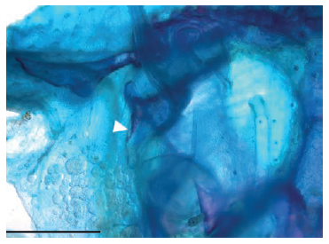 The second autapomorphy (although intraspecifically variable in a relatively small proportion, 5.6% of 71 studied specimens) is the presence of a single sensory pore at the posteriormost section of the infraorbital canal. Most trichomycterids (non-trichogenines, non-copionodontines) with an interrupted infraorbital canal have two sensory pores, i10 and i11. Potamoglanis, an undescribed species of Tridens from the Colombian Amazon, Tridensimilis, Stegophilinae, Vandelliinae, Sarcoglanis, and Glanapteryx also have a single sensory pore in this section of the infraorbital canal. Once again, this homoplastic pattern is more parsimoniously interpreted as two independent losses, one in the TSVSG clade, which includes the subfamilies Tridentinae, Stegophilinae, Vandelliinae, Sarcoglanidinae, and Glanapteryginae (Costa and Bockmann, 1993; Ochoa etal., 2017), and another in T. rosablanca within trichomycterines.
