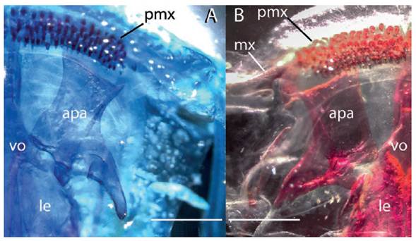 Another derived character shown by Trichomycterus rosablanca consists of the lachrimal/antorbital bone not enclosing the infraorbital canal (Figure 3). Plesiomorphically the anteriormost section of the infraorbital canal (bearing the sensory pores i1 and i3) is enclosed by a hollow posterior section of the lachrimal/ antorbital. This bone in T. rosablanca apparently lost its tubular posterior section, remaining as a compact bone still attached through a posterior pointed process to the anteroventral margin of the infraorbital canal. A slightly different condition is verified in T. arleoi (Fernández-Yépez, 1972) and T. mondolfi (Schultz, 1945), where the anteriormost section of the infraorbital canal is also free from the lachrimal/antorbital, but the bone is completely detached from the infraorbital canal, having lost its posterior tubular portion and keeping only the anteriormost compact portion that is associated with the anterolateral corner of the anterior cartilage of the autopalatine. The phylogenetic relationships of T. arleoi and T. mondolfi plus two closely related undescribed species are being addressed in an ongoing study by C. DoNascimiento (in prep.).