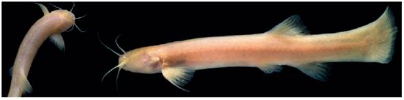 Head depressed, almost as wide as long, trapezoidal in dorsal view. Eyes absent. Mouth subterminal. Lateral fleshy lobe of lower lip rounded. Premaxilla with four irregular rows of conical teeth. Dentary with four irregular rows of teeth, similar to those of premaxilla. Anterior nostril surrounded by low fleshy thin flap, higher posteriorly and laterally continuous with nasal barbel. Posterior nostril anteriorly framed by fleshy elevated margin, decreasing in high posteriorly and leaving a posterior notch. Barbels dorsoventrally flattened and tapered distally. One specimen of 51.9 mm SL (IAvH-P 15812) with right maxillary barbel basally branched, both branches of similar length. Nasal barbel originating from lateral margin of anterior nostril, almost reaching base of opercular patch of odontodes. Maxillary barbel extending to pectoral-fin insertion. Rictal barbel extending to posterior margin of fleshy flap of interopercular patch of odontodes. Interopercular patch with 24-31 odontodes and 10-15 replacement odontodes, arranged in two irregular rows. Posterior interopercular odontodes of medial row largest and slightly curved medially at tip. Opercle with 11-14 odontodes and 3-5 replacement odontodes, disposed in approximately 5 anteroposterior irregular rows. Posteriormost opercular odontodes largest. Branchial membrane united across isthmus and supported by 7 branchiostegal rays (one CS specimen with six branchiostegal rays on right side). Branchiostegal rays 4-7 distally expanded. Branchiostegal ray 5 with greatest distal expansion.