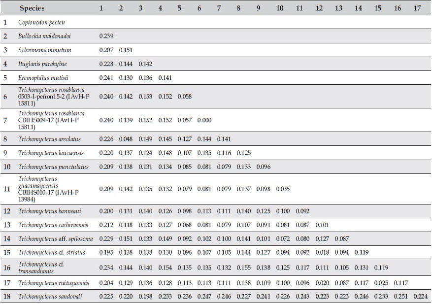 Genetic identification. The resulting alignment of the COI gene sequences consisted of 618 bp, with no insertions, deletions or stop codons. Nucleotide frequencies were 25.3% adenine, 27.7% cytosine, 17.9% guanine, and 29.2% thymine. Considering all base positions, 406 sites were invariant, 216 were polymorphic, and 157 were parsimony informative. The mean K2P distance between species was 0.138, while the mean divergence between Trichomycterus species was lower (0.117±0.009). The maximum distance was found between T. rosablanca and T. sandovali with 24.7% (Table 3). The two sequences of T. rosablanca did not show intraspecific variation. Graphical structure of the distance data is shown in the NJ tree (Figure 12), indicating that T. rosablanca is closer to Eremophilus mutisii and represents a distinct lineage from the other trans-Andean species analyzed (including the most similar in general appearance T. sandovali). The tree topology of the GMYC analysis is identical to that shown in the Figure 12 and indicates the presence of 17 operational taxonomic units, with a threshold time of 0.0003512371, which indicates the time before which all nodes represent diversification events and after which all nodes in the tree reflect coalescent events. The likelihood of the null model was 65.8095 and the maximum likelihood of the GMYC model was 67.05544. Genetic divergence and delimitation species analyses indicate that all species examined possess COI sequences that allow their mutual recognition.