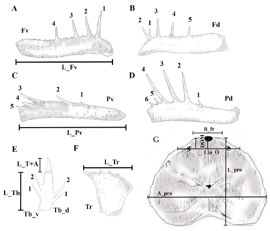 En el morfoespacio del ACP, se encontró que entre el primer y segundo componente se acumula el 68.9% de la varianza en los datos morfológicos (Figura 3). En general, se encontraron altas correlaciones entre las variables morfológicas, como longitudes corporales, pero baja correlación de estas con variables discretas, como el número de espinas y tubérculos. Por otra parte, los ejemplares de Lérida (Figura 3) se agruparon en relación a variables del tipo conteos (caracteres discretos).