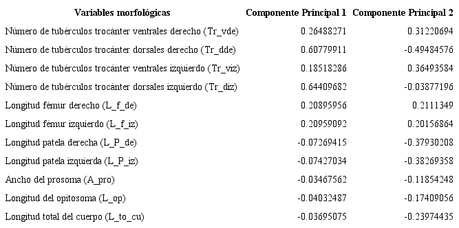 Las variables morfológicas que tuvieron mayor variación en el CP1y CP2 para H. boterorum fueron: número de tubérculos ventrales y dorsales en el trocánter derecho e izquierdo, longitud fémur derecho e izquierdo, longitud patela derecha e izquierda, largo del opistosoma, ancho del prosoma y longitud total del cuerpo (Tabla 1). Estos caracteres morfológicos fueron importantes en la diferenciación de H. boterorum en Lérida (Figura 3).