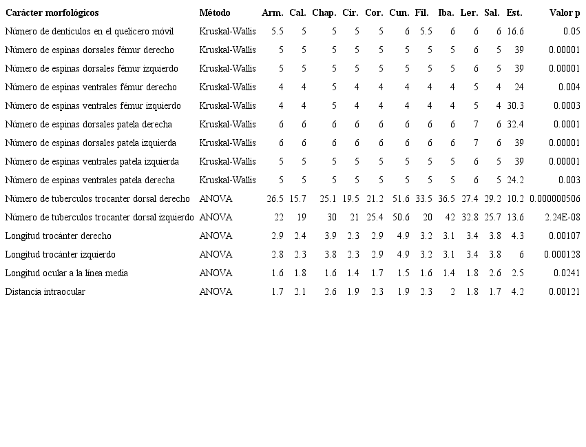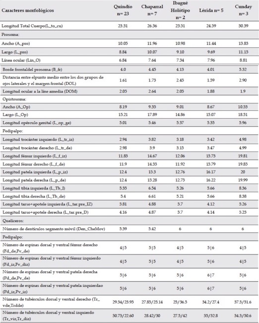 En el análisis de varianza o Kruskal-Wallis, se encontraron diferencias significativas (p<0.05) en 15 caracteres morfológicos relacionados con conteos (11 caracteres discretos) y mediciones corporales (cuatro caracteres continuos), al comparar las poblaciones de cada localidad (Tabla 2). Se observó que en el número de espinas en el fémur y patela, la población de Lérida se diferencia del resto, presentando siempre una espina más en estos segmentos en vista dorsal y ventral (Tabla 2). En el caso del número de dentículos en el segmento móvil queliceral, las poblaciones de Cunday, Lérida e Ibagué presentan un dentículo más que la mayoría de los especímenes, diferenciándose de las poblaciones de Calarcá, Circasia y Filandia, pero compartiendo esta misma condición con algunos individuos de poblaciones de Armenia, Chaparral, Córdoba y Salento.