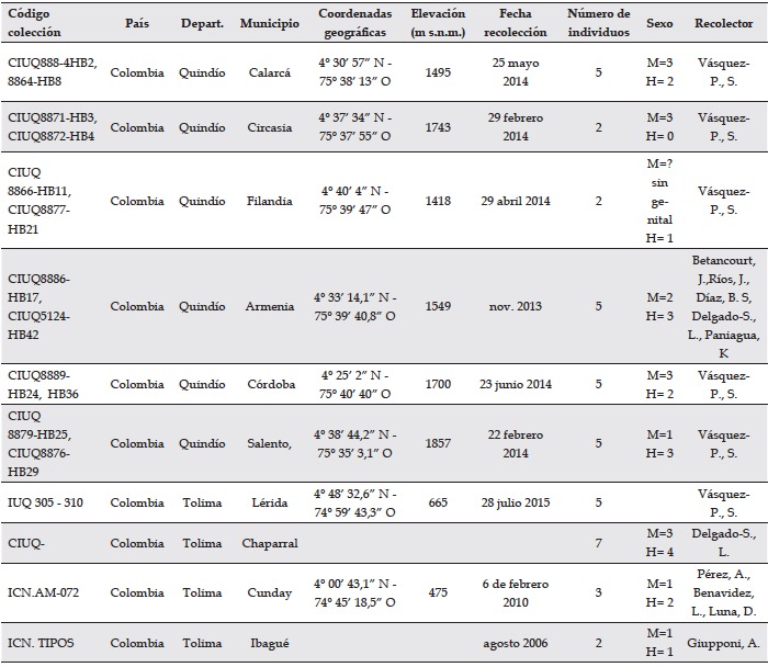 Material analizado. Se revisó material museológico, y se realizaron algunas recolecciones en campo, de individuos machos y hembras, entre octubre del 2010 y junio del 2015. De la vertiente oriental de la cordillera Central y la vertiente occidental de la cordillera Oriental (Tolima) se obtuvieron 17 individuos, entre los 591 y 1247 m s.n.m., distribuidos en las localidades de Chaparral [n= 7], Cunday [n= 3], Ibagué [n= 2] y Lérida [n= 5]; de la vertiente occidental de la cordillera Central (Quindío) se encontraron 23 individuos entre los 1457 y 1935 m s.n.m., en las localidades de Armenia [n= 5], Calarcá [n=4], Circasia [n=2], Córdoba [n= 5], Filandia [n= 2] y Salento [n= 5] (Figura 1).