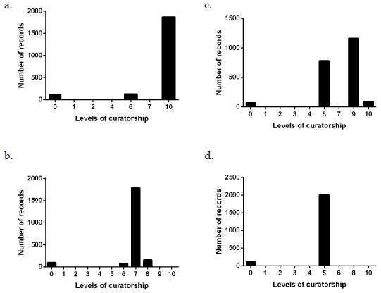 The figure of 3.22 % of fields empty for the specimens collected before 2000 reflects the fact that the collection has old specimens which do not fulfill the Darwin Core standard. This emphasizes the need of a special analysis for specimens older than 10 years. Even if they do not meet modern standards, those specimens are of vital importance, because they can be used for genetic studies involving species and populations already extinct (Burrell et al., 2015). These collections also offer the opportunity to do future research in taxonomy and evolutionary history of species located in remote areas, using modern techniques (Besnard et al., 2016).