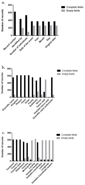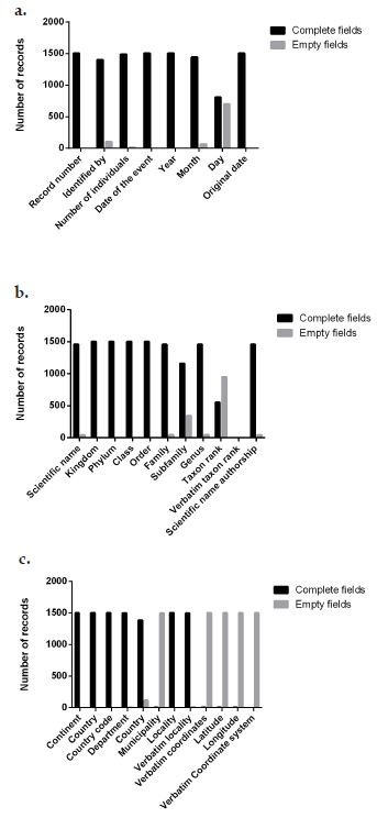The Completeness of collection data was determined from the formula proposed by Vallejo & Acosta (2005) and Instituto Humboldt (2007), evaluating if each specimen had the minimum data required, according to the 87 fields stated in the Darwin Core 3.0 standard, published by SiB Colombia. For the Museo de La Salle, 39 fields are mandatory and the remaining 48 are recommended. Of the 39 mandatory fields, 12 are geographic (continent, country, country code, department, municipality, town center, locality, original location, original coordinate, original latitude and longitude and original coordinate system), 11 are taxonomic (scientific name, kingdom, phylum, class, order, family, genus, taxon category, original category of the taxon and authorship of the scientific name), and 8 are associated with the collection event, DW (registration number, identified by, number of individuals, date of the event, year, month, date and original date of the event).
