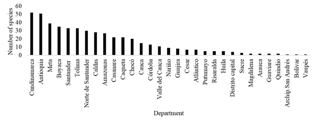Geographical representation. At the department level, the collection has a high geographical representation, showing specimens from 31 of the 32 departments (96.87 %). The department with the highest number of records and species is Cundinamarca, with 363 records and 52 species, followed by Santander, with 260 records and 33 species. The departments with the least number of records are Vaupés, Bolívar and the Archipelago de San Andrés Providencia y Santa Catalina, with one species each (Figure 5).