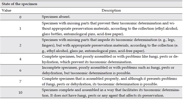 The indices used in this study may generate a diagnosis in which all the necessary aspects for the conservation of biological collections are considered, and thus monitoring, maintenance and improvement strategies may be developed. In this way, the role of collections as sources of information for different types of research about taxonomy, biological diversity, geographic distribution or genetics, among others, may be enhanced.