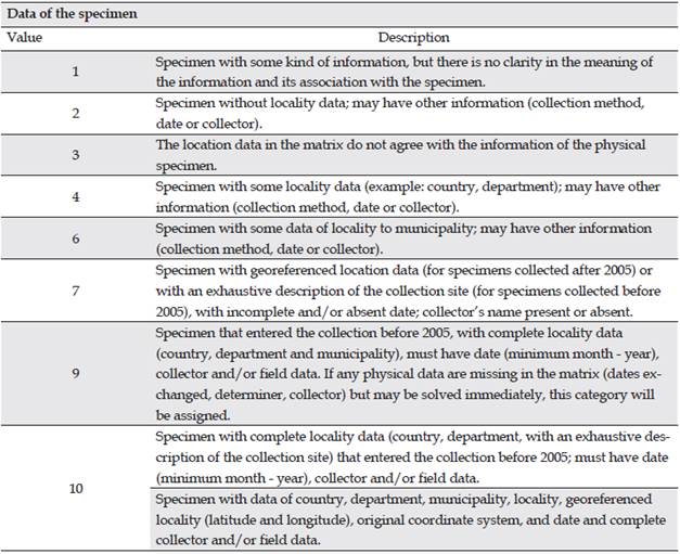Category 2 (SD): Specimen data. This category assesses the presence or absence of a description, locality data (department and municipality), georeferenced localities (that have additional information (DW), such as collection date and/or collector). In this category, the age of the specimens was taken into account, in order not to discriminate specimens collected before 2000 that do not meet the currently proposed standards. The criteria for evaluating this category are found in Table 2.