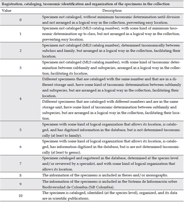 Category 3 (RCTIO): Registration, cataloging, taxonomic identification and organization. This category evaluates if the specimen has some type of taxonomic determination (family, genus or species) and if it is cataloged. The criteria for evaluating this category are found in Table 3.
