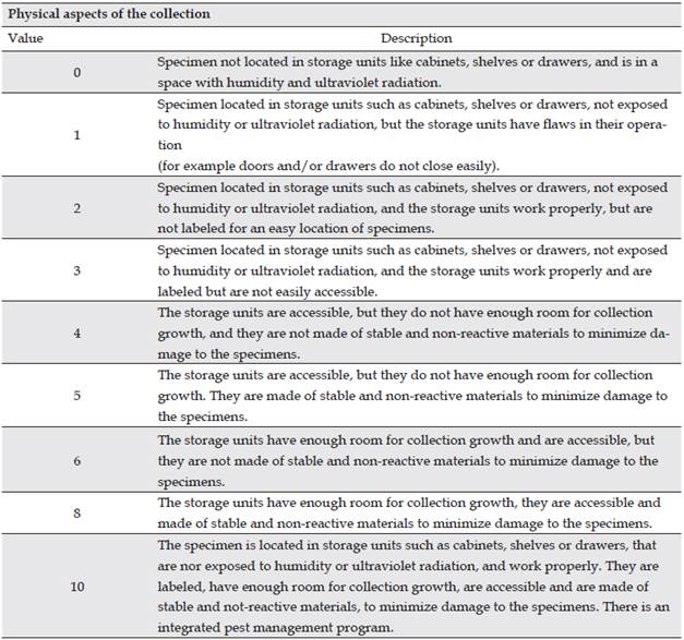Category 4 (FA): Physical aspects of the collection. This category evaluates the location of the specimens, conditions and materials of storage units, and access to specimens. This category considers also problems of humidity or radiation. The criteria for evaluating this category are found in Table 4.