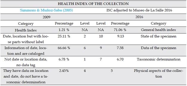 The current health index of the La Salle collection shows that its curatorship has improved. In 2009 the collection was arranged taxonomically, and today it is completely based on a catalog number system and numerically arranged. In the new method proposed here, specific aspects of the specimens were considered and not only general aspects that could cause a conflict when deciding the assignment of a curatorial level (Appendix 1). When analyzing each category separately, it is possible to see that not all categories are at the same level, which allows proposing management strategies and determining improvements for each category.