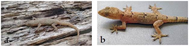 En noviembre de 2015 se hicieron conteos en diferentes lugares de la ciudad, especialmente en el centro, donde se revisaron cuatro manzanas localizadas entre las carreras 8 y 10, y las calles 7 y 9 (numeradas de 1 a 4). En diciembre del mismo año se hizo un muestreo cerca al puerto civil y otro en el Aeropuerto Internacional Alfredo Vásquez Cobo. Durante estos muestreos se realizaron capturas y conteos de los ejemplares de las dos especies, así como la observación de las distintas interacciones intra e interespecíficas. Para evitar la repetición en el conteo de ejemplares, los sitios fueron revisados una sola vez durante los muestreos. Las dos especies se diferenciaron porque H. mabouia presenta cola bandeada de color gris y una piel dorsal más tuberculada (Fig. 1); así mismo, en esta especie las lamelas subdigitales del cuarto dedo del pie, no alcanzan la base del dedo (Kluge, 1969; Köhler, 2003; Krysko & Daniels, 2005).