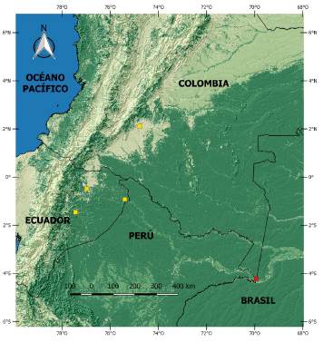 En la elaboración del mapa se utilizaron los datos de la Amazonia presentados por Caicedo-Portilla & Dulcey-Cala (2011) y Torres-Carvajal (2015), los cuales fueron graficados con el registro que se presenta en este trabajo por medio del programa Quantum GIS versión 2.18.14z (QGIS Development team, 2017).