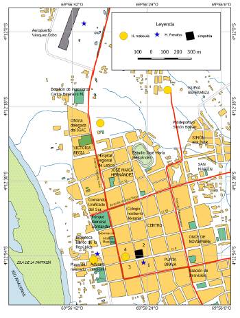 El primer sitio de Leticia donde se detectó H. frenatus (Figura 1A,) fue en un establecimiento comercial en el centro de la ciudad (Figura 2); este ejemplar se observó a finales de febrero de 2015, el 13 de marzo de ese mismo año se capturó el primer espécimen (SINCHI R 0455), y se pudieron observar otros tres individuos. El 23 de marzo se capturaron dos ejemplares en los locales aledaños a ese establecimiento; esa misma noche, en la manzana número 1, y parte de la manzana número 3 se pudieron observar al menos 30 individuos, pero no se observó ningún ejemplar de H. mabouia. Posteriormente, el 25 de abril se capturó otro ejemplar en el centro de Leticia; esa noche se observaron 20 ejemplares.