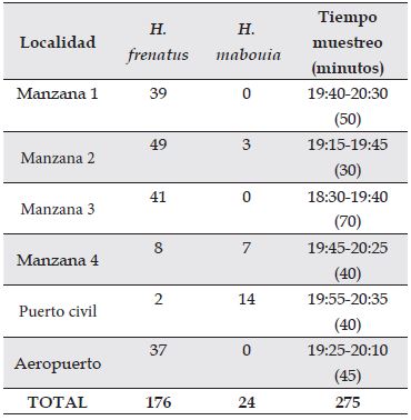 Durante el mes de diciembre, en los locales que quedan cerca del puerto civil se registró un mayor número de H. mabouia, y solo se registraron dos ejemplares de H. frenatus en las paredes de un local comercial. En la zona externa de las bodegas solo se registraron subadultos, mientras que no se encontraron adultos en la zona de bodegas del aeropuerto (Tabla 1). Los ejemplares de H. frenatus se observaron en las paredes y vidrios de las casas y locales, entre 2 y 7 m de altura.