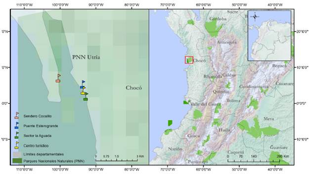 El estudio se llevó a cabo en el Parque Nacional Natural Utría, que comprende los municipios de Bahía Solano, Nuquí, Alto Baudó y Bojayá, en el departamento del Chocó. El PNN Utría tiene una extensión de 54 380 ha, con cuatro ecosistemas: arrecifes de coral, manglares, bosque húmedo tropical y medio marino. Además, comprende altitudes desde los 0 a 1200 m s.n.m. Se realizó el muestreo entre el 15 de agosto y el 14 de septiembre de 2017 en localidades con diferente tipo de cobertura de bosque: (1) Entrada Sendero Cocalito/ Borde de playa, (2) Puente Esterogrande/ Ecosistema de Manglar, (3) Sector La Aguada/Borde de playa y (4) Centro de guía turístico (CGT)/ Ecosistema Bosque Húmedo Tropical (Figura 1).