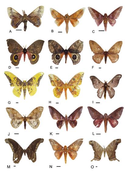 Para la identificación taxonómica se siguió la clasificación de Kitching (http://sphingidae.myspecies.info/) para la familia Sphingidae, Lemaire (1978, 1980, 1987, 2002) para la familia Saturniidae y descripciones originales (Forbes, 1939) para la familia Bombycidae. Los especímenes se depositaron en la colección Entomológica del Museo de Historia Natural de la Pontificia Universidad Javeriana (MPUJ_ENT).