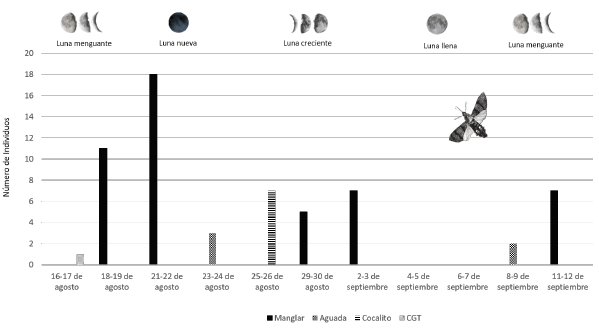 Al compararse el número de individuos recolectados en la trampa de luz en las diferentes localidades y fases lunares evaluadas, se corrobora la hipótesis de la fobia lunar, propuesta por Janzen (1984). Este autor explica que las polillas vuelan en línea recta con un ángulo constante teniendo un punto de referencia y orientación, como la luna y las estrellas. Si en una noche de luna nueva se pone un bombillo en mitad del bosque, la polilla usará esa luz como punto de referencia, donde su vuelo que va en un ángulo constante se convertirá en una espiral y terminará por llegar a la trampa. Por el contrario, en una noche de luna llena, la trampa de luz no tendrá ningún efecto en la orientación y vuelo de las polillas, pues se ha demostrado que los esfíngidos acortan su actividad y el número de satúrnidos que llega a las trampas se ve disminuido (Janzen, 1984). En el PNN Utría, el mejor muestreo del mes se obtuvo durante la luna nueva, con 18 individuos recolectados, mientras que en los muestreos con luna llena no se capturaron especímenes (Figura 5). Sin embargo, Nowinszky et al. (2010) proponen una nueva hipótesis en la que plantean que la disminución en la actividad de las polillas y la iluminación lunar se debe a una relación entre el ciclo de vida de cada especie y las fases de la luna, razón por la cuál es de importancia conocer los ciclos de vida para cada especie.