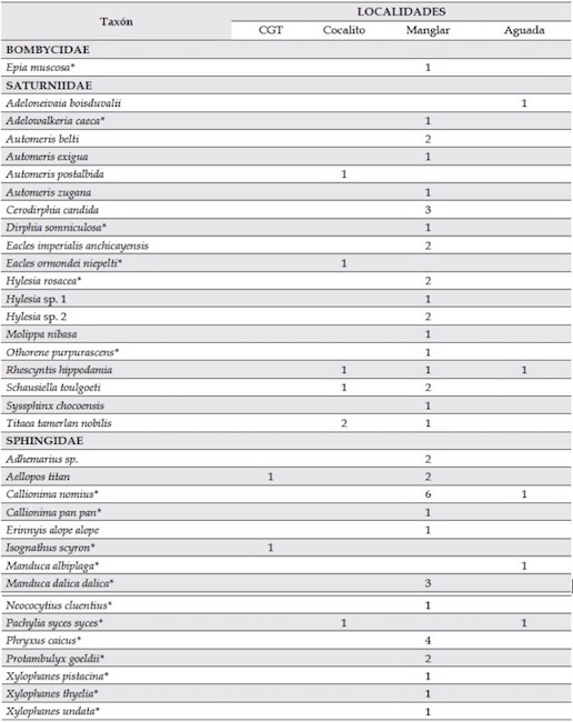 A pesar de los esfuerzos realizados por diferentes investigadores en el país para la recolección de datos faunísticos de polillas, aún existen áreas pobremente estudiadas. Esto nos lleva a realizar de forma cautelosa la comparación de fauna con la única investigación para satúrnidos en la región del Chocó biogeográfico, llevada a cabo por Decaëns et al. (2003). Allí, 59 especies de satúrnidos fueron registrados entre los meses de agosto y octubre en el municipio de San José de Palmar (Chocó), en altitudes entre los 1200 y los 1500 m s. n. m. Adicionalmente, los autores hacen énfasis en lo poco que se conoce de los satúrnidos en la zona costera del Chocó. Debido a esto, nuestro trabajo fue enfocado en el muestreo en localidades cercanas al nivel del mar, registrándose especies que no se encontraron en San José del Palmar como: Adelowalkeria caeca, Automeris postalbida, Schausiella toulgoeti y Syssphinx chocoensis.