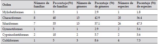 La predominancia de especies de los órdenes Characiformes y Siluriformes coincide con lo encontrado los Andes tropicales (Anderson & Maldonado-Ocampo, 2011) y en el valle medio del río Magdalena. Estos dos grupos han experimentado la radiación adaptativa más importante (85 % de la riqueza), en los sistemas fluviales de Suramérica (Albert & Reis, 2011).