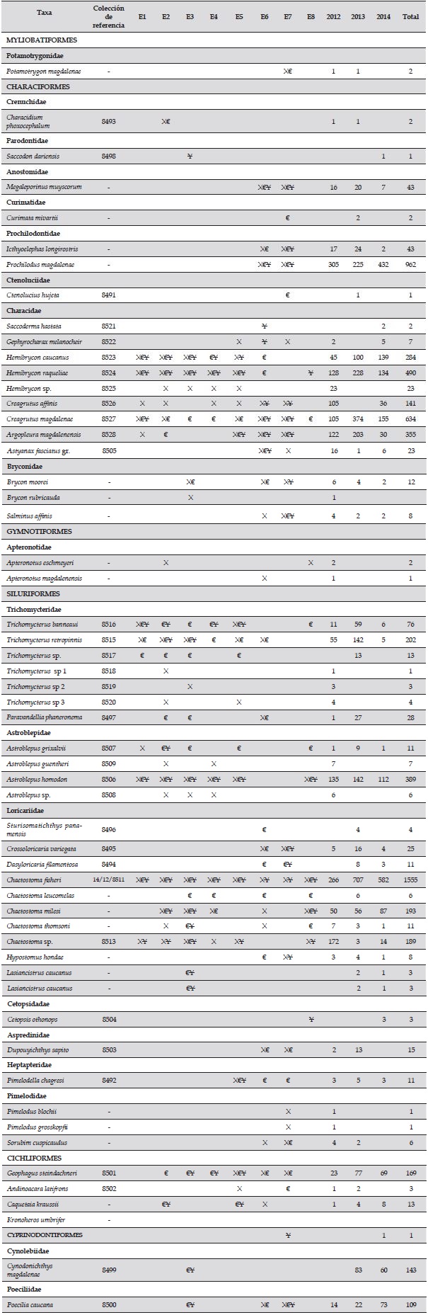 Las especies más abundantes fueron Chaetostoma fisheri (24.8 %), Prochilodus magdalenae (15.4 %), Creagrutus magdalenae (10.1 %), Hemibrycon raqueliae (7.8 %) y Astroblepus homodon (6.2 %), que representaron más del 60 % de las capturas. Tres especies (C. fisheri, C. magdalenae y H. raqueliae) estuvieron ampliamente distribuidas entre las diferentes estaciones durante los tres años, y una especie (C. fisheri) estuvo en todas las estaciones durante el 2012, y en el 75 % de ellas en el 2013 y 2014.