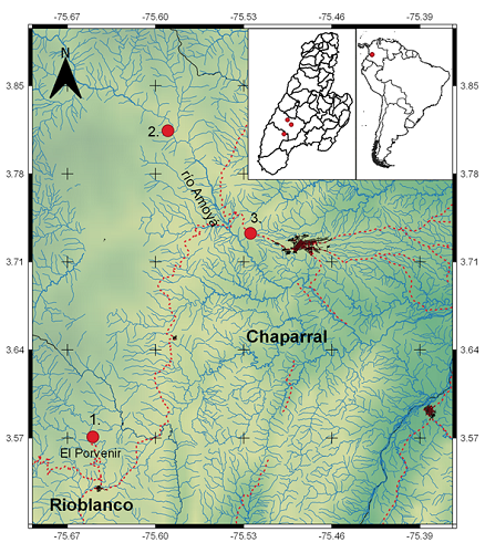 2) Vereda Vega Chiquita (Chaparral, Tolima; 03°48’51.1’’N, 75°35’24.8’’O), en el margen del río Amoyá a 1132 m s. n. m.; comprende una zona de reforestación con especies como el cedro rosado (Cedrela odorata) y acacio forrajero (Leucaena sp.) y cultivos abandonados de cacao (Teobroma cacao) en una zona de vida bosque húmedo premontano. En septiembre de 2016 se emplearon cinco redes de niebla estándar (12 m x 2.5 m, 32 mm de ojo de malla), distribuidas en diferentes hábitats de la zona, operadas entre 06:00 -11:00 horas y 15:30-17:30 horas.