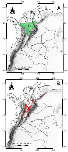 Las novedades taxonómicas mencionadas han hecho que los mapas de distribución se deban ajustar a la información más reciente; un ejemplo de esto son Chaparro-Herrera et al. (2013) que catalogan a C. leucorrhoa como una especie casi endémica, con un rango geográfico más amplio que no se ajusta a los mapas de distribución más recientes (Ayerbe-Quiñones, 2018). Por ejemplo, ellos la incluyen al noroeste del Pacífico colombiano y Panamá, pero en realidad su distribución no incluye esas regiones, pues su rango geográfico es más restringido: más del 50% la distribución de esta especie está en Colombia. Otro escenario interesante es que en los últimos años ha habido varios reportes de C. leucorrhoa al sur de la distribución actual conocida. De acuerdo con diversos reportes en eBird (https://ebird.org/species/whbman2), hacia el valle alto del Magdalena hay registros en Paquiló (Cundinamarca) y para el departamento del Tolima hay varios registros en los municipios de Líbano y Fresno. Por lo tanto, estos registros hacen suponer que la distribución geográfica de esta especie podría ser más amplia de lo que se ha considerado, siendo necesario un modelamiento para actualizarla. Por eso en este estudio, a través del reporte en tres localidades recientes en el departamento del Tolima y los registros históricos para C. leucorrhoa, proponemos un nuevo mapa de distribución potencial para esta especie en Colombia.
