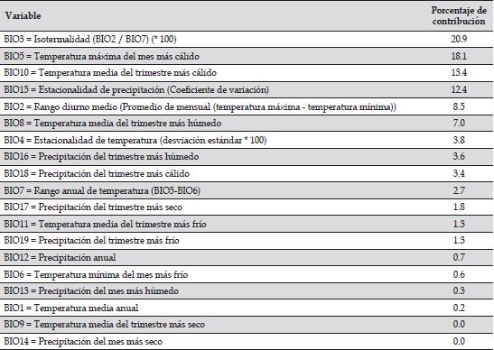 El modelo de distribución para Corapipo leucorrhoa obtuvo un AUC de 0.942, lo que significa que el modelo tiene un buen ajuste. Las predicciones realizadas para esta especie indicaron que podría tener una distribución continua con una mayor presencia en la región del Magdalena medio, disminuyendo gradualmente hacia los piedemontes del valle alto del Magdalena (Tolima, Cundinamarca), por lo cual esta región debe ser incluida como parte de su distribución geográfica para Colombia, pues el modelo muestra que la probabilidad de presencia de la especie en la región es mayor al 70 % (Figura 2). En general las variables con mayor contribución al modelo de distribución de C. leucorrhoa son las que se encuentran relacionadas con la temperatura y la estacionalidad de la precipitación, con porcentajes de 20.9-7.0% (Tabla 1).
