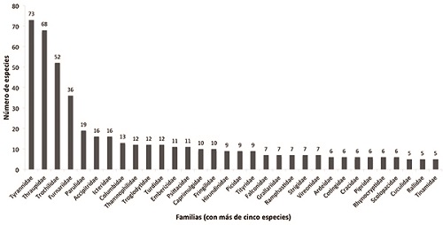 Familia. Accipitridae, Alcedinidae, Anatidae, Anhingidae, Apodidae, Ardeidae, Bucconidae, Capitonidae, Caprimulgidae, Cardinalidae, Cathartidae, Charadriidae, Cinclidae, Columbidae, Conopophagidae, Corvidae, Cotingidae, Cracidae, Cuculidae, Emberizidae, Falconidae, Formicariidae, Fringilidae, Furnariidae, Galbulidae, Grallariidae, Hirundinidae, Icteridae, Incertae, Mimidae, Motacillidae, Nyctibiidae, Odontophoridae, Pandionidae, Parulidae, Picidae, Pipridae, Polioptilidae, Psittacidae, Rallidae, Ramphastidae, Rhynocryptidae, Scolopacidae, Steatornithidae, Strigidae, Thamnophilidae, Thraupidae, Threskiornithidae, Tinamidae, Tityridae, Trochilidae, Troglodytidae, Trogonidae, Turdidae, Tyrannidae, Tytonidae, Vireonidae.