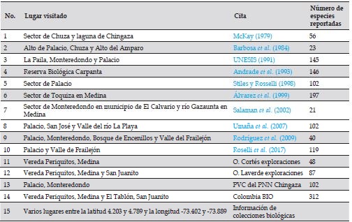 Realizamos una revisión de artículos y documentos sobre la avifauna del PNN Chingaza. Tuvimos en cuenta artículos y documentos técnicos que reportaran listas de especies de aves. La búsqueda realizada en la colección bibliográfica de Parques Nacionales Naturales (en el centro de documentación del área protegida) arrojó 10 referencias, entre 1979 y 2017, para diferentes sectores del PNN Chingaza y su zona de amortiguación (Figura 1, Tabla 1). Adicionalmente, dentro de los recorridos de Prevención, Vigilancia y Control (PVC) del PNN Chingaza, entre los años 2013-2016, fueron visitadas tres localidades a lo largo del flanco occidental del parque (sector Palacio, Monterredondo y La Paila) y en la zona de amortiguación del sector oriental (Medina, Meta). Dos salidas de campo adicionales en septiembre 2016 y abril de 2017 fueron realizadas en la vereda Periquito, en el municipio de Medina, sector oriental del parque y en San Juanito, Meta (Figura 1). En todos estos recorridos registramos las aves con binoculares 10x42 a lo largo de transectos de ca. 1.8 km de largo, siguiendo la metodología propuesta por Villarreal et al. (2004).