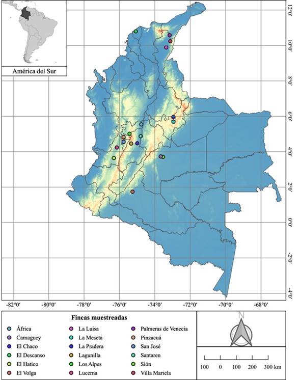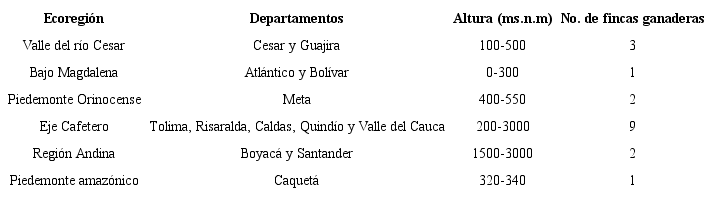 Descripción del área de estudio. En total se muestrearon 18 fincas ganaderas ubicadas en ocho departamentos de Colombia: Atlántico (1), Boyacá (2), Caldas (2), Caquetá (1), Cesar (3), Meta (2), Tolima (3) y Valle del Cauca (4), pertenecientes a 6 ecorregiones: Valle del río Cesar; Bajo Magdalena; Piedemonte Orinocense; Eje Cafetero; Región Andina y Piedemonte Amazónico (Tabla 1).