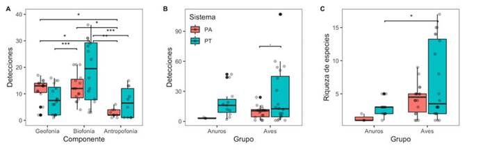 La mayor diferencia de las detecciones del componente biofonía se encontró en las aves (Tabla 3). Las detecciones de aves fueron marginalmente diferentes entre los dos sistemas (Figura 3B, P = 0.08). Sin embargo, se encontraron pocas detecciones de anuros en sistemas de potreros arbolados. Al igual que con las detecciones de componente de paisaje sonoro, todos los modelos mejor ajustados para las detecciones de los dos grupos taxonómicos revisados (aves y anuros) incluyeron la distancia a vías como variable más importante (Tabla S2, Figura S3). En cuanto al número de especies de anuros y aves (Figura 3C), la diferencia más marcada fue entre la riqueza de aves y anuros en potreros tradicionales (Figura 3c, P = 0.043). Cinco de los seis modelos mejor ajustados incluyeron las variables distancia a vías y distancia a quebradas como las variables más importantes para explicar la variación de riqueza de estos dos grupos (Tabla S2, Figura S4). Aunque no se profundizó en la identificación de insectos acústicamente activos, se obtuvieron 237 detecciones (102 para potreros arbolados y 135 para potreros tradicionales).